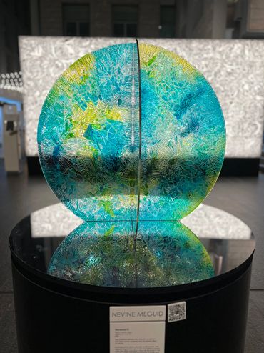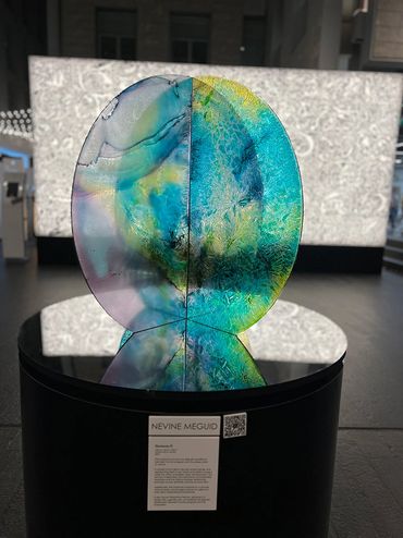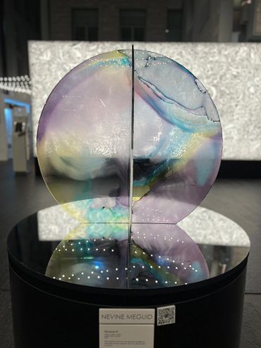 Harmony II is a rotating sculpture that reflects the balance between human development and environmental preservation. Made from two circular acrylic panels—one symbolising Earth’s forests and oceans, the other representing urban growth— it emphasises sustainable practices. Mounted on a mirrored base, it encourages viewers to contemplate their role in this delicate equilibrium, with its rotation symbolising the interconnectedness of progress and nature.
