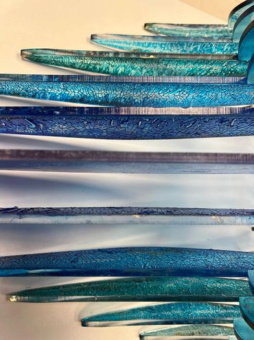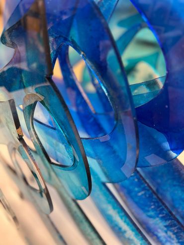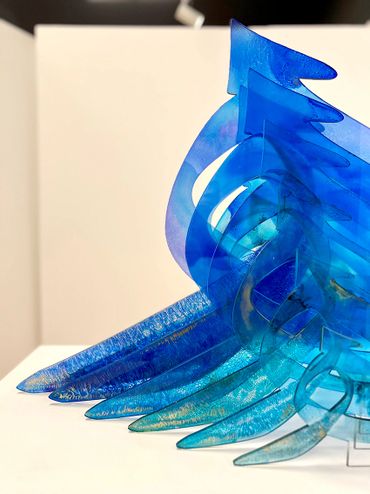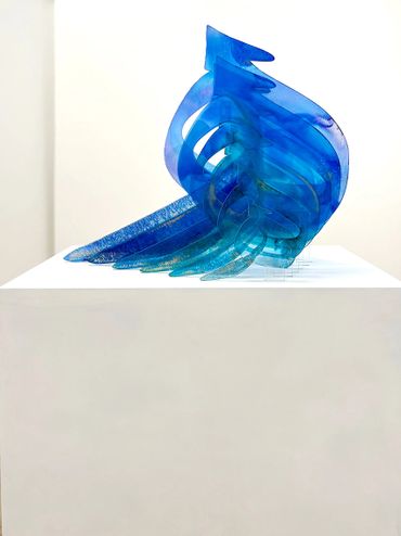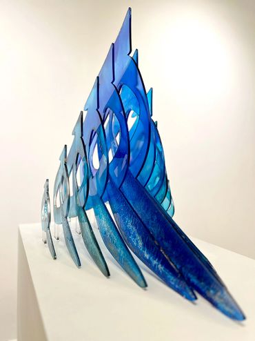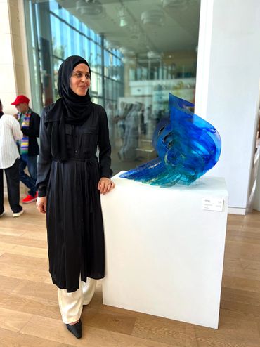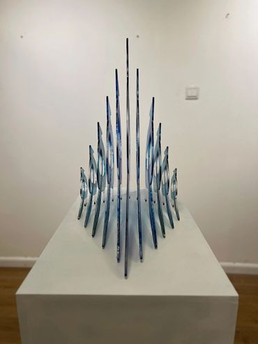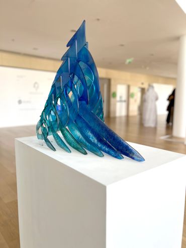 "Contentment" is a blue-toned acrylic sculpture of 11 stylised Arabic letter "Ha" ح , representing gratitude’s transformative power. The varying sizes and layers evoke breathing’s rhythm, symbolising mindfulness and balance. Set on a sleek podium, the sculpture invites viewers to explore from different angles, experiencing its peaceful atmosphere of reflection and tranquillity.