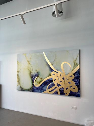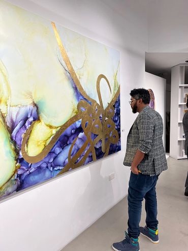Creating this 150 x 250cm piece was a true challenge but exhibiting it at Khawlah Art Gallery in Dubai’s Design District made it worthwhile. Opening night buzzed with artists, friends, art collectors, and appreciators, and I was honored to showcase alongside talented locals Sara Alharbali and Misq. Our pieces harmonized beautifully, making for a successful and memorable exhibition.
